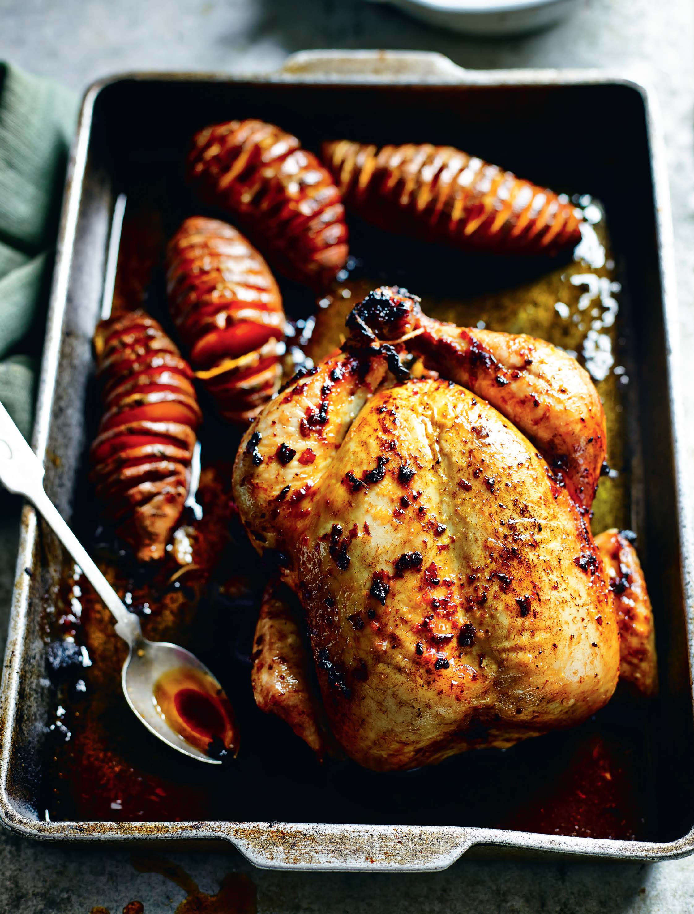 3: Before cooking stuff some coriander and the lemon halves inside of the chicken cavity. Roast in a pre heated oven set at 190c / gas mark 5 for 45 mins per kilo plus 20 minutes. With an hour left of the cooking time for the chicken place the potatoes onto the tray. After half an hour run a fork across the top of the potatoes to fan them out and while you are at it baste the chicken. The chicken is ready when the juices run clear when a skewer is inserted into the thickest part. Serve up and garnish with some fresh coriander.