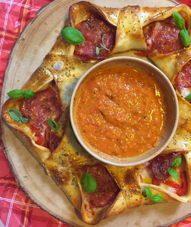 Shape the pizza dough into a 12" diameter then place onto a lined baking sheet then cut an X into the centre of the dough followed by a vertical cut to form a star using a pizza cutter or sharp knife. Spread some of the tomato sauce onto the base making sure you leave a 1-2 cm gap around the edge and around the star. Place on the pepperoni, peppers and mozzarella which has been pulled into small pieces, pull up the edge of the dough to meet the centre cut then fold over, repeat until you have a wreath shape then egg wash and sprinkle with the dried oregano and a pinch of salt.